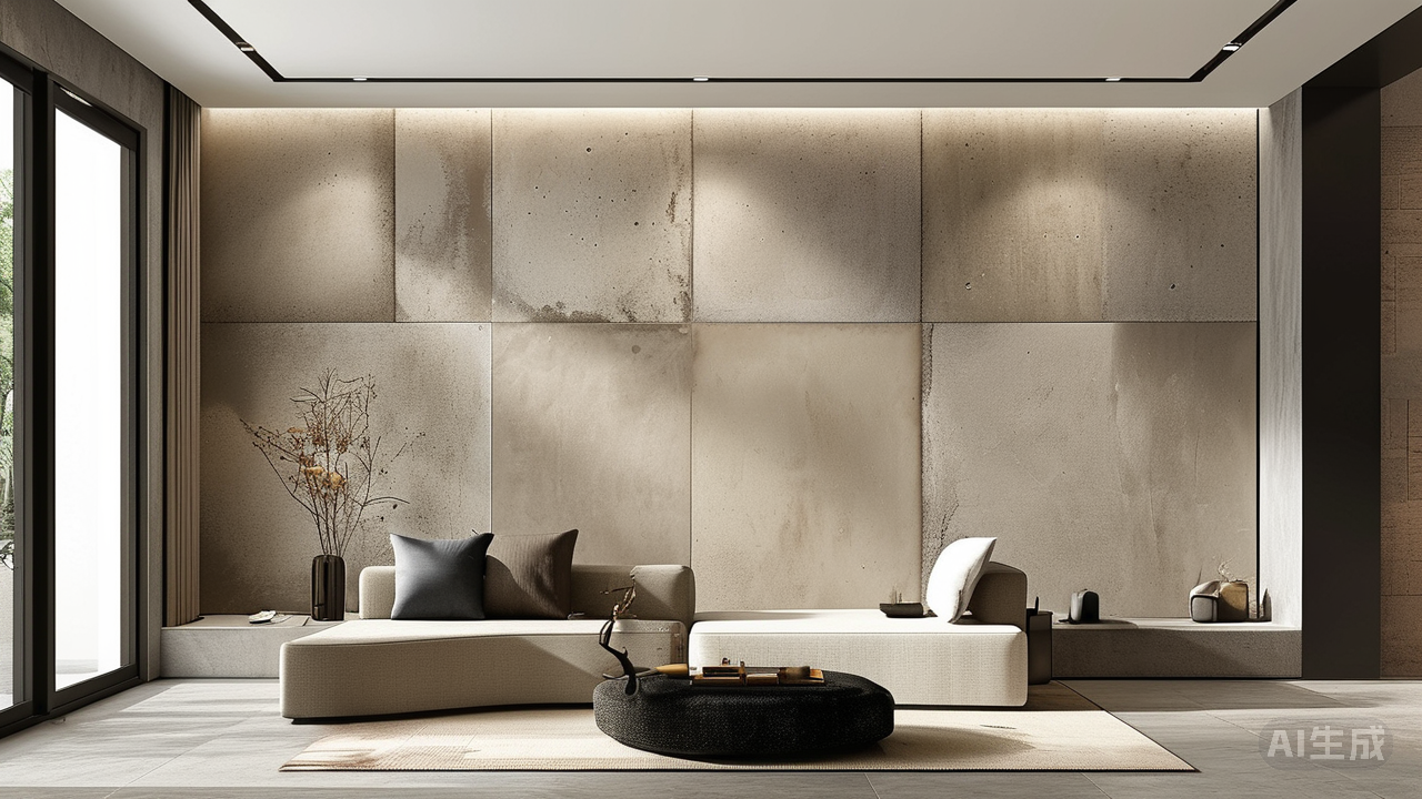 细干粒半抛工艺:如筑迹Pro系列的石涅灰砖,通过模具与细干粒半抛技术,呈现细腻肌理与微闪光感,层次立体且触感丰富,完美契合侘寂风的低调奢华。