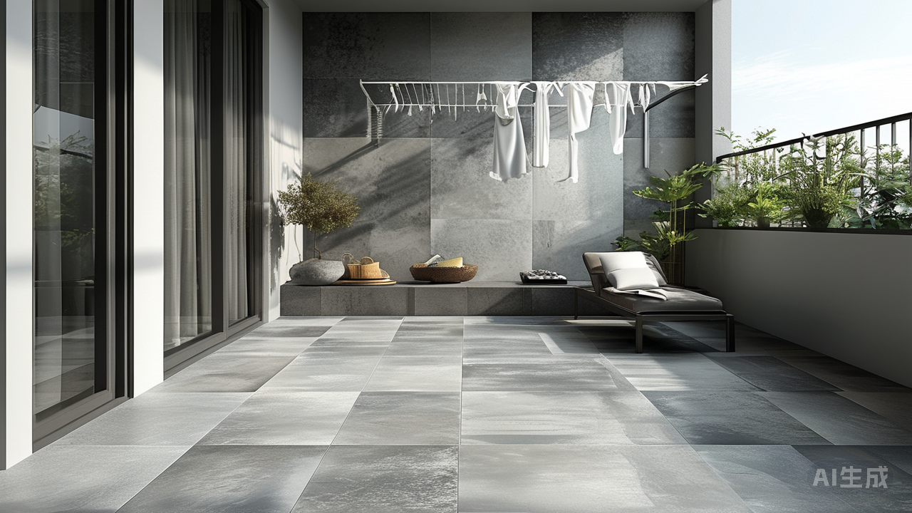 生活阳台宜选用中性色系通体砖,耐脏且与家务工具色调融合,保持视觉整洁。